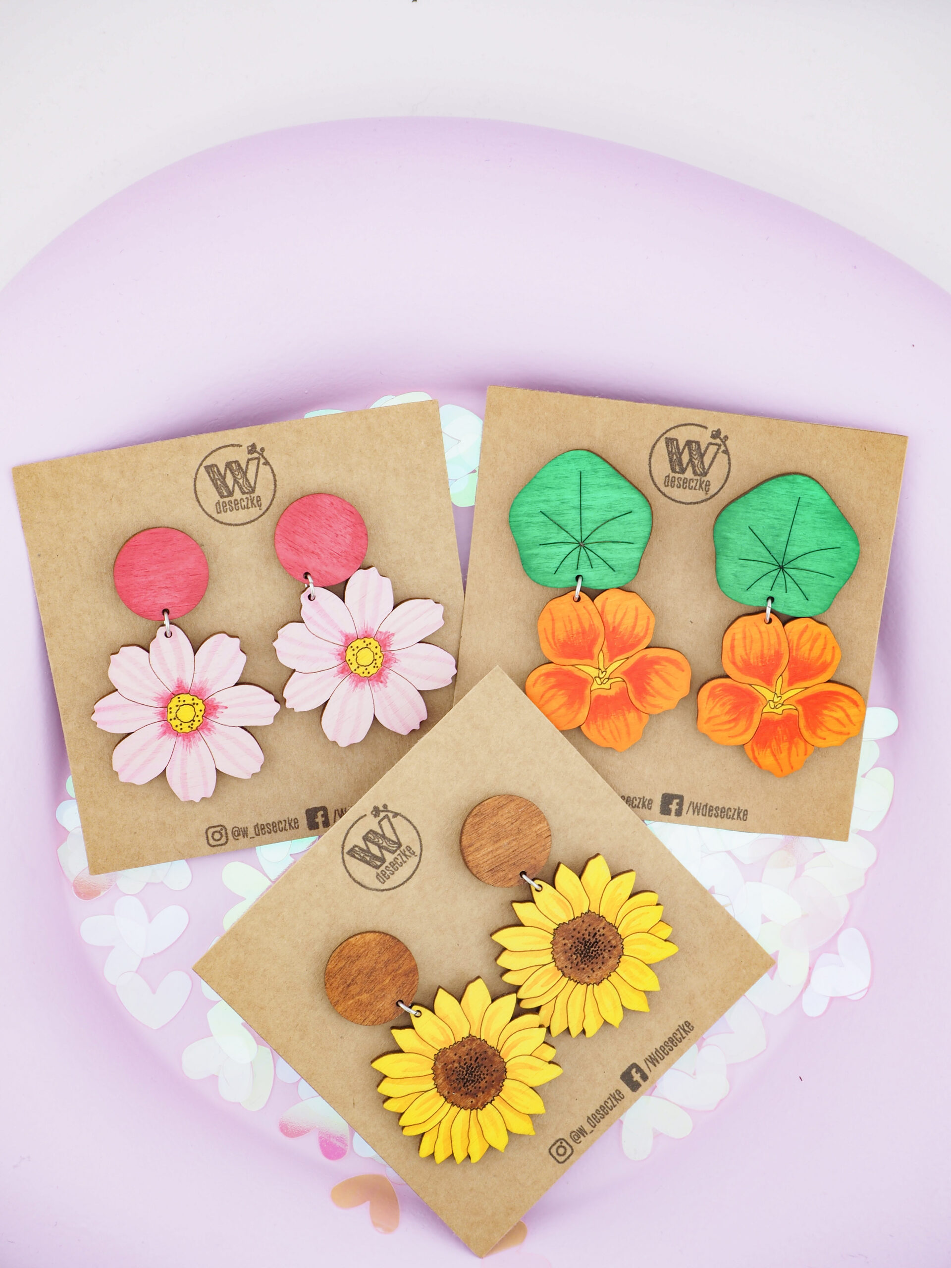 - Twórca: Kamila z marki W Deseczkę – artystka, która zamienia kawałki drewna w małe, ruchome dzieła sztuki. Zajmuje się wszystkim: od projektowania, przez wycinanie laserem i malowanie, po dostarczenie Ci powodu do uśmiechu za każdym razem, gdy zakładasz te kolczyki.
