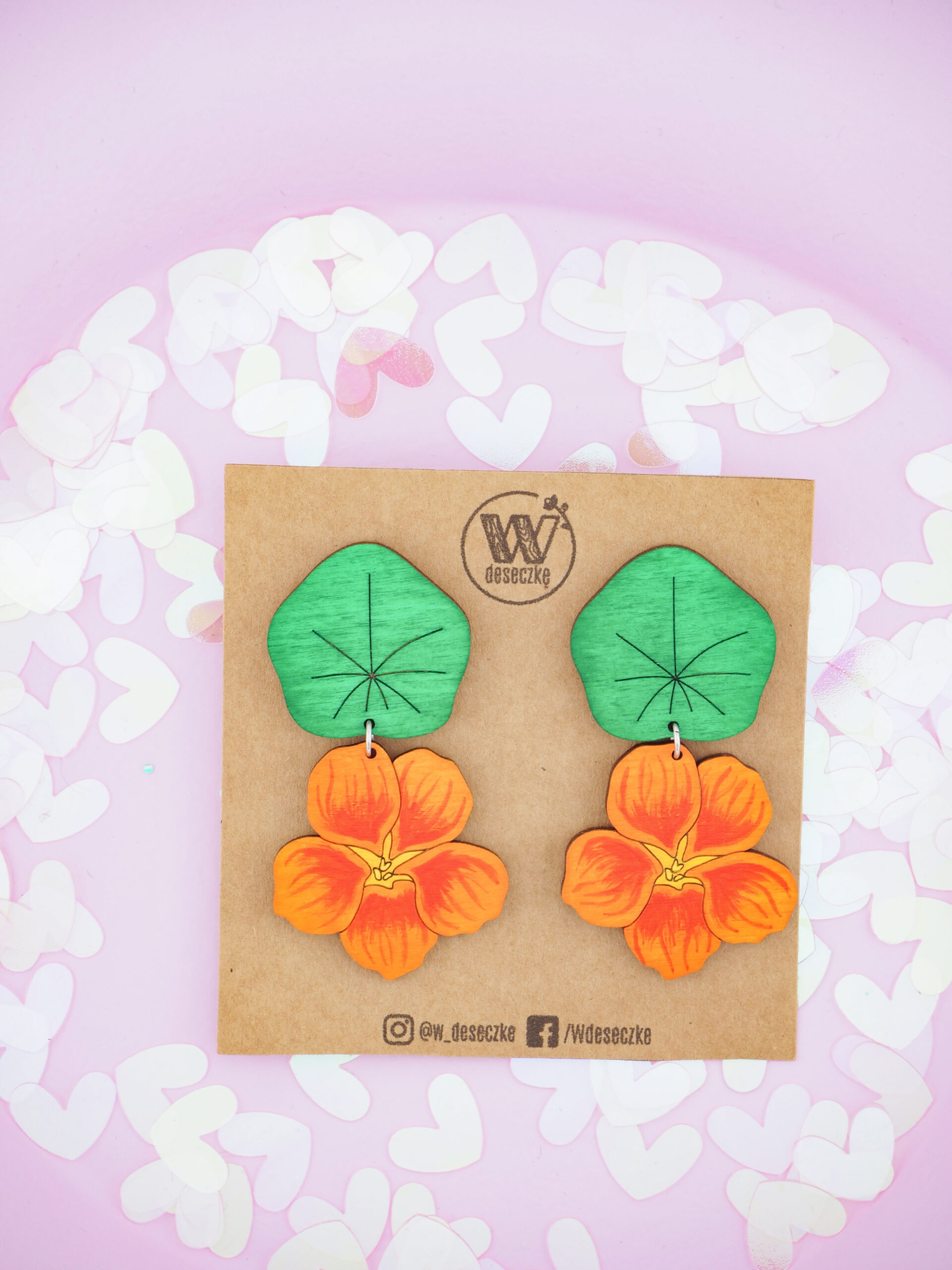 Kolczyki o wysokości 6,5 cm i szerokości 3,5 cm. Baza to liść nasturcji, do którego na kółeczku przymocowany jest kwiat nasturcji ze środkiem z żółtymi pręcikami i płatkami w dwóch odcieniach pomarańczu. Jak mały fragment egzotycznego ogrodu, który zawsze masz przy sobie. Doskonałe dla osób o odważnym stylu, które nie boją się przyciągać uwagi. Te kolczyki są jak mały zachód słońca na Twoich uszach – trudno oderwać od nich wzrok.