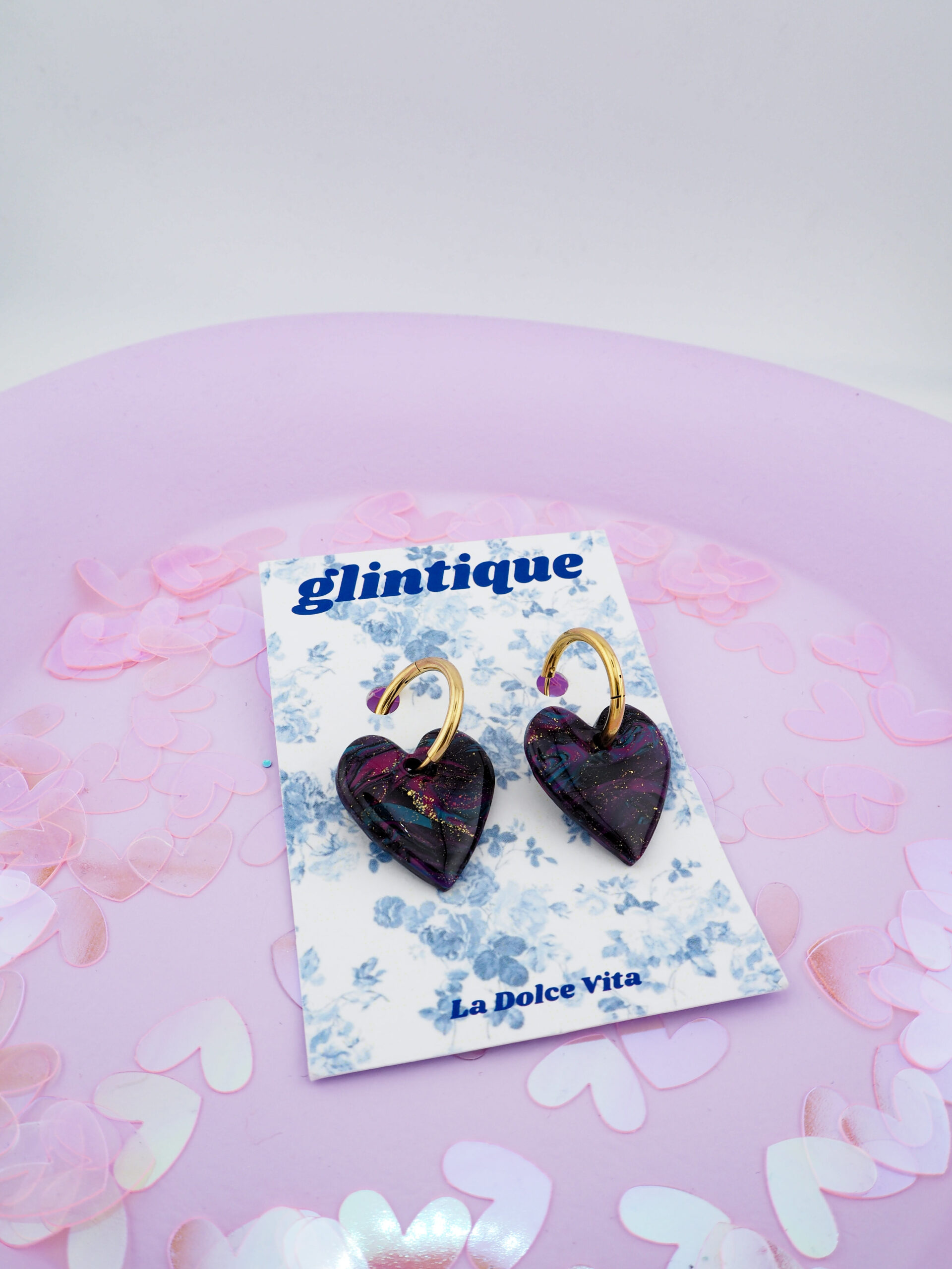 Serduszko z efektem marmuru w odcieniach czerni i cielistego różu zawieszone na złotym kółku. Odważne, nowoczesne, z nutą tajemniczości. Doskonałe dla tych, którzy lubią nietypowe połączenia kolorystyczne i subtelny dramatyzm.