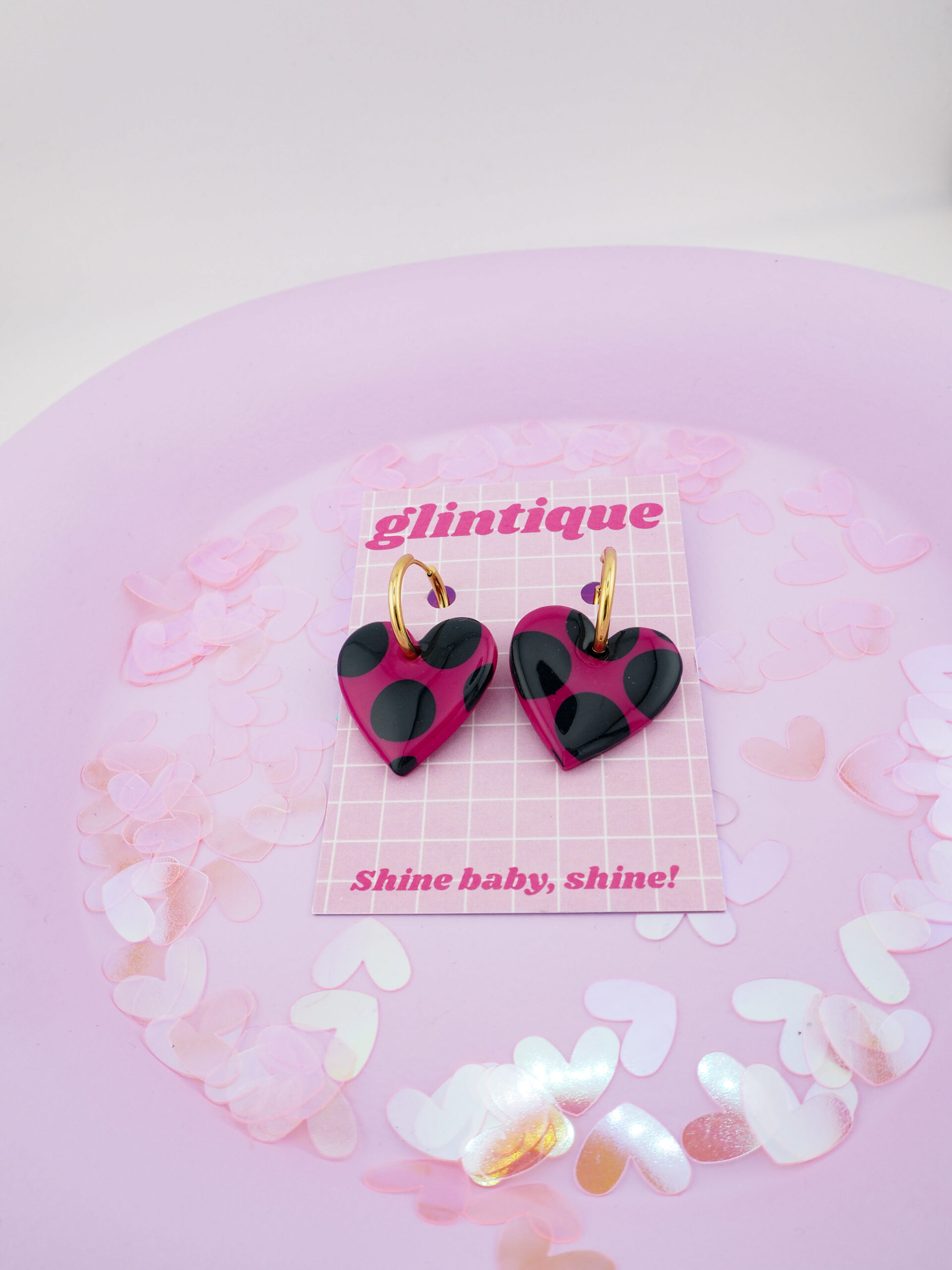 Ciemnoróżowe serduszko z dużymi czarnymi kropkami zawieszone na złotym kółku. Zabawne, z nutą pop-artu, przywodzące na myśl beztroskie lata 80. Doskonałe dla osób z poczuciem humoru i miłością do wyrazistych dodatków.