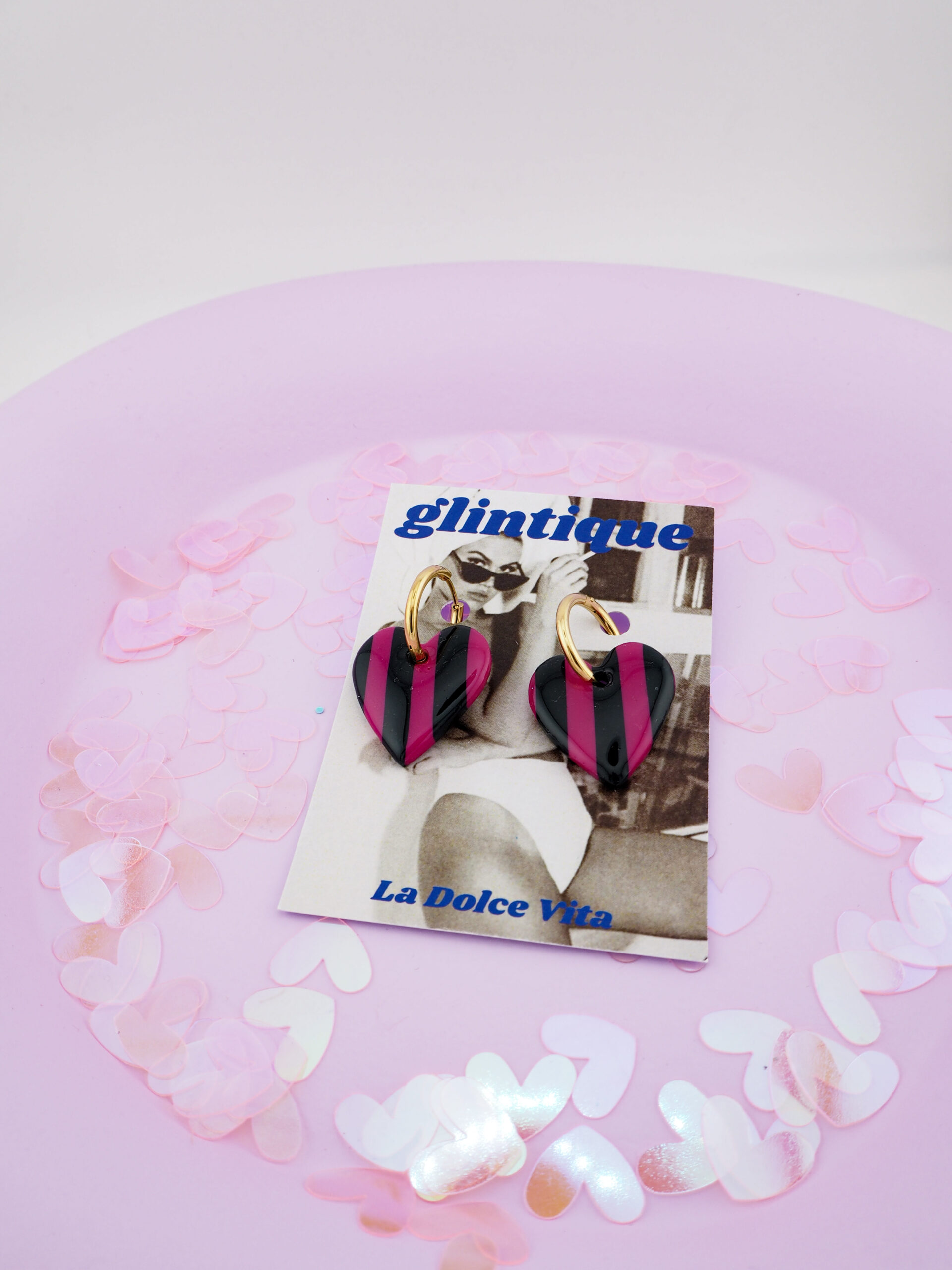 Serduszko w czarno-ciemnoróżowe paski zawieszone na złotym kółku. Graficzne, wyraziste, z retro charakterem. Idealne dla miłośniczek wyraźnych wzorów i kontrastowych zestawień, które nie przechodzą bez echa.
