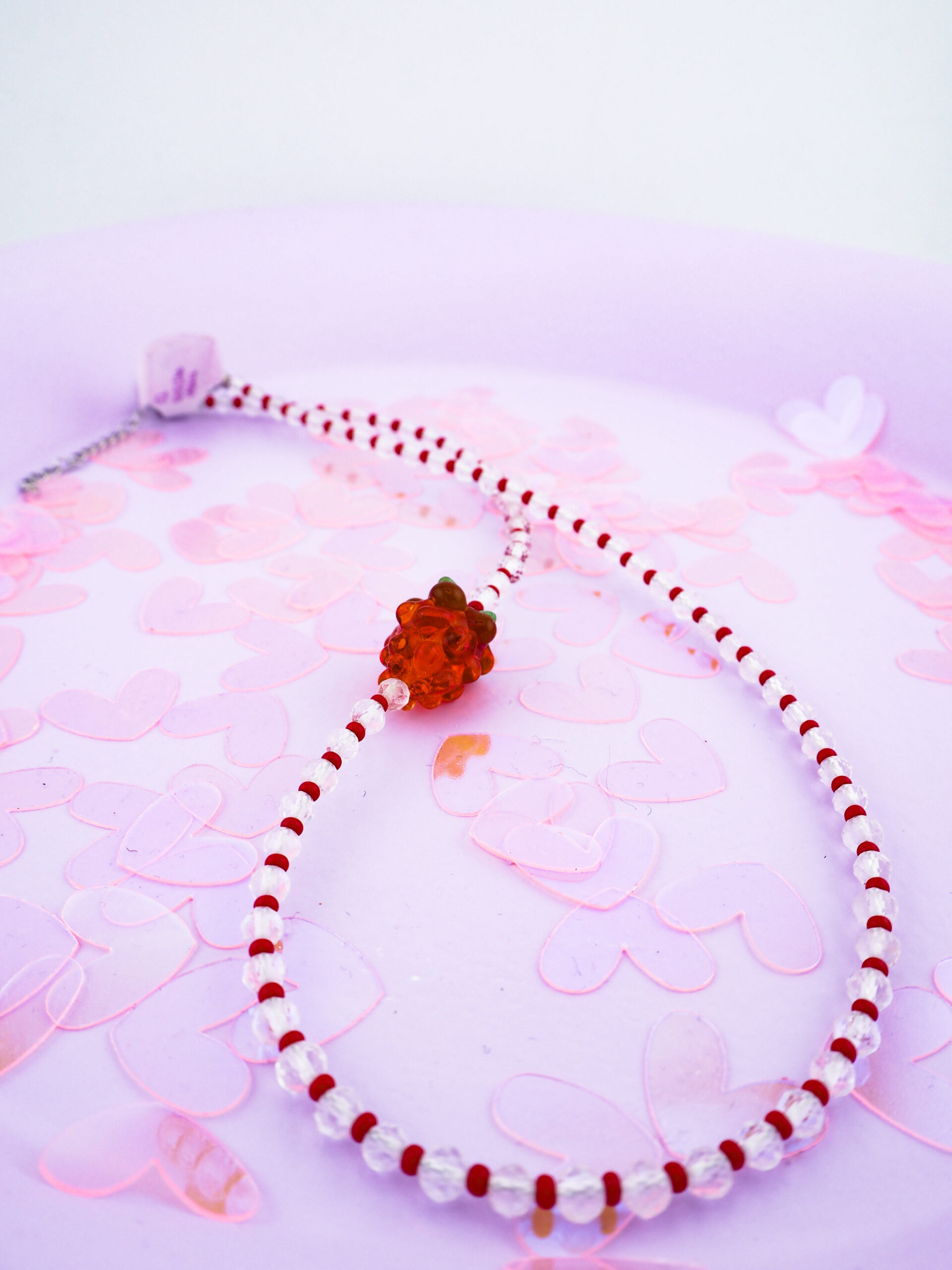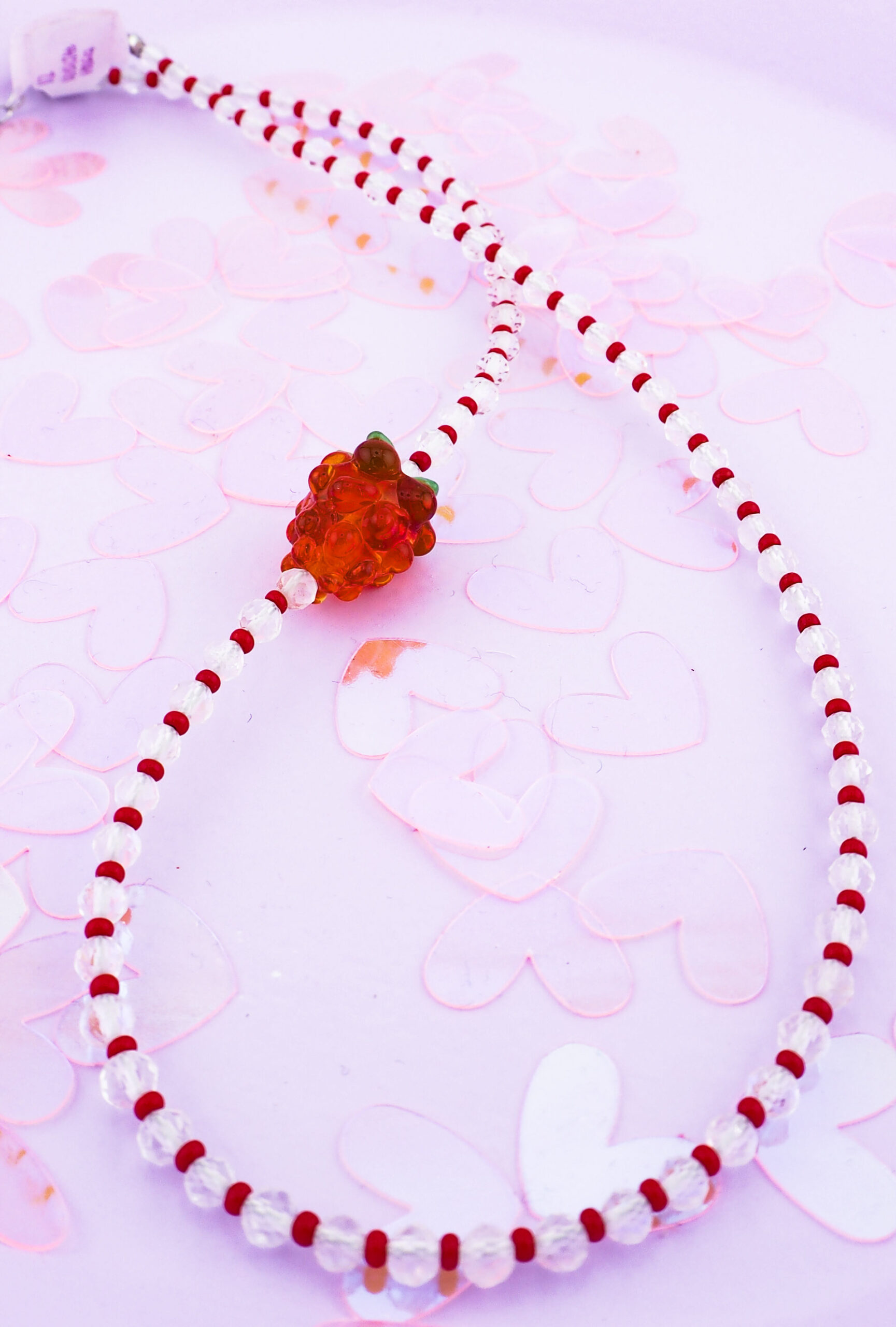 - Materiał: Koraliki kryształu górskiego przeplatane czerwonymi szklanymi koralikami Preciosa, ponieważ niektórzy lubią energetyczne akcenty.