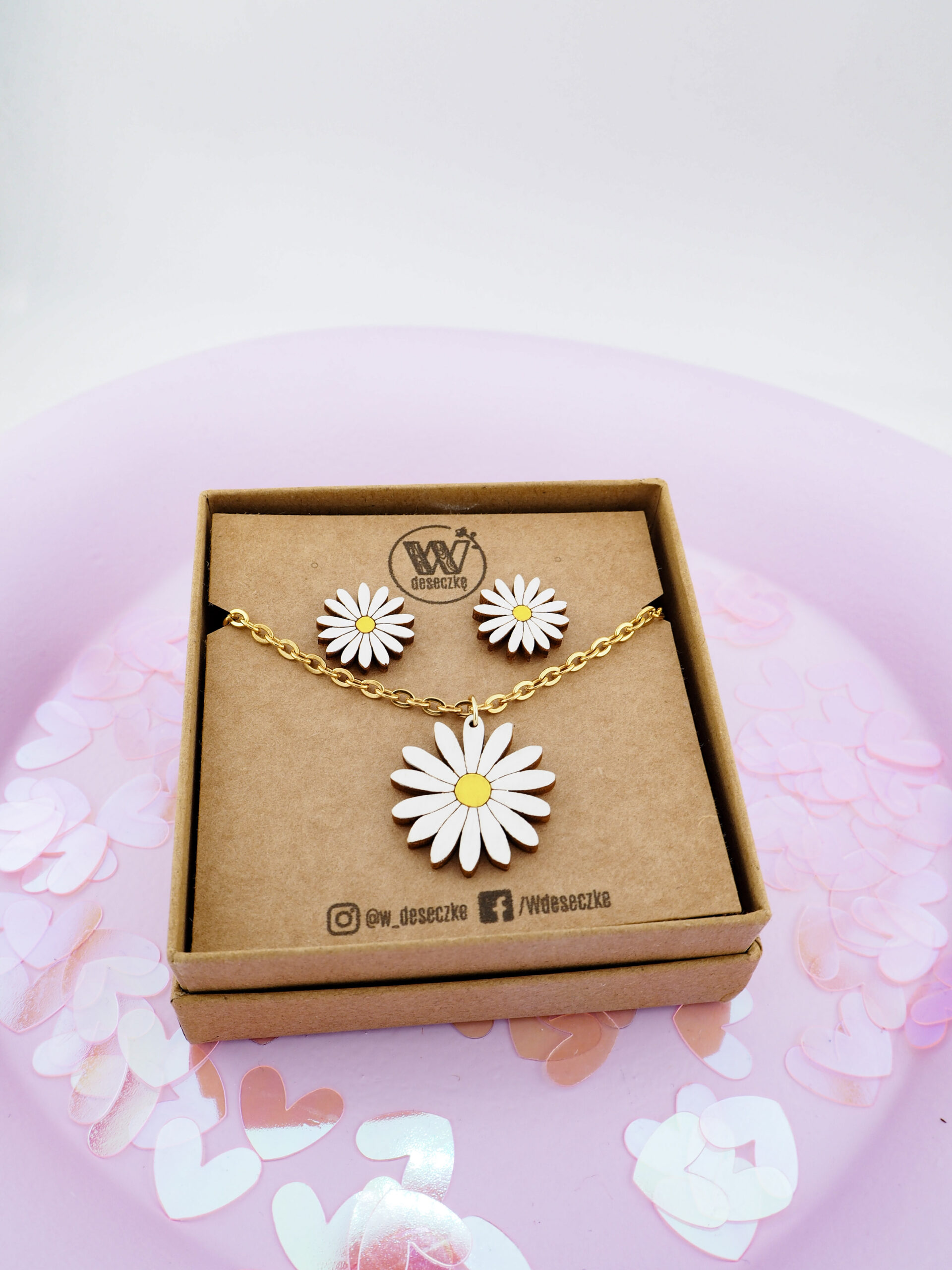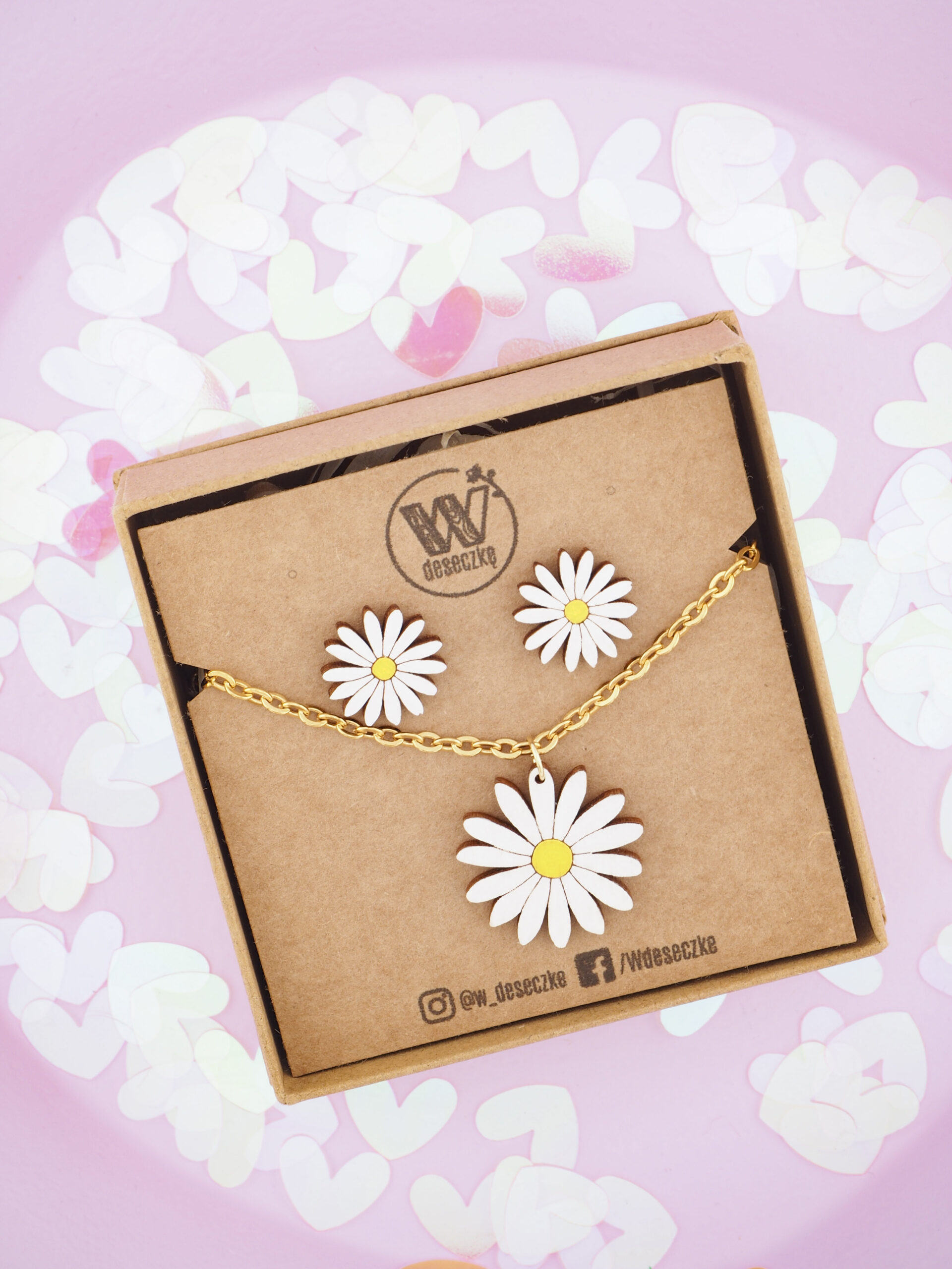 Klasyczne białe stokrotki z żółtym środkiem na złotych elementach ze stali szlachetnej. Przypominają słoneczny, letni dzień na łące. Są jak promyk słońca, który możesz nosić cały rok. Idealny zestaw dla miłośniczek ciepłych, złotych dodatków i prostego, naturalnego piękna.