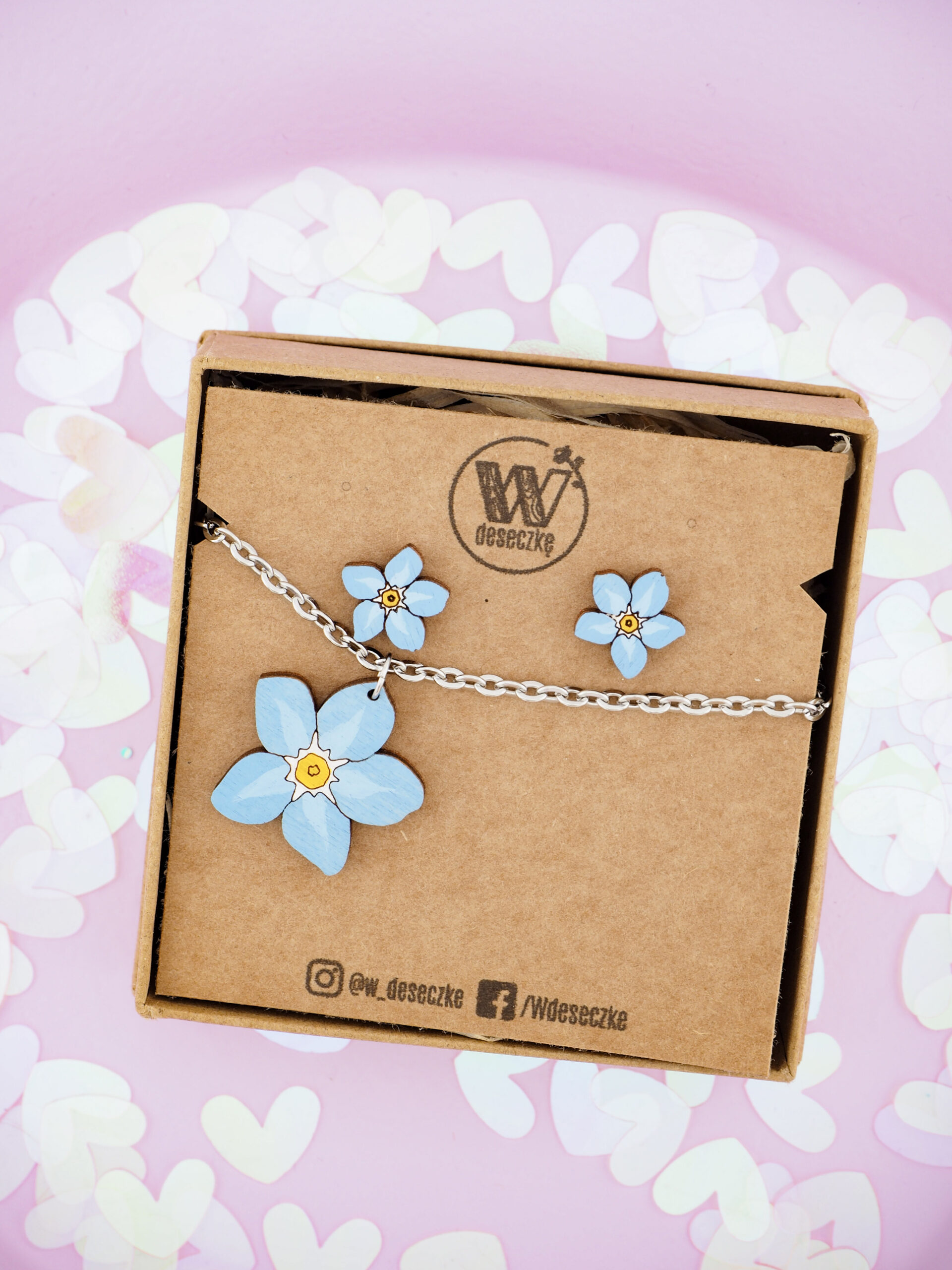 Delikatne niebieskie niezapominajki na srebrnych elementach ze stali szlachetnej. Przywodzą na myśl chłodny, wiosenny poranek nad jeziorem. Są jak skrawek błękitnego nieba, który zawsze masz przy sobie. Doskonały wybór dla osób preferujących srebrną biżuterię i chłodniejsze odcienie kolorów.